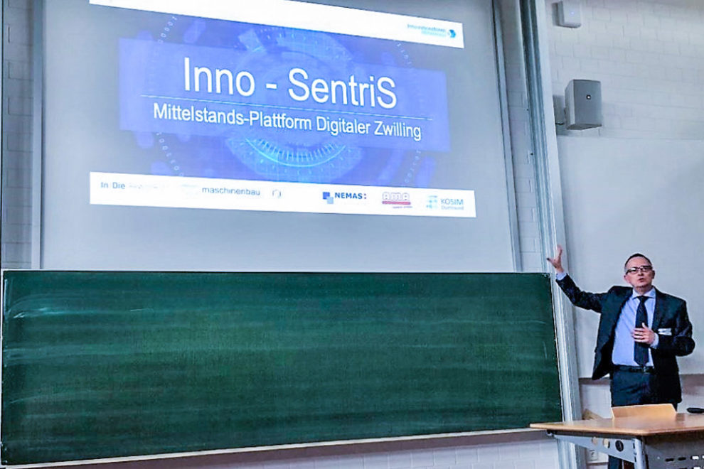 Dr. Frank Brehmer präsentierte in seinem Vortrag die Innovationsplattform InnoSentriS zum Digitalen Zwilling für den Mittelstand. Im Nachgang wurden bereits erste Anwendungsfälle diskutiert, bei denen das Netzwerk eine Schnittstelle zwischen KMUs und Technologiepartner darstellen kann. Es zeigte sich, dass es zu dem Begriff des Digitalen Zwillings eine Vielzahl von Definitionen gibt. Neben dem grundsätzlichen Verständnis, dass ein Digitaler Zwilling immer auch aus einem simulativen Abbild besteht, wird sich im Rahmen des Netzwerkes „InnoSentriS“ die Begriffsdefinition unter anderem an dem jeweiligen Anwendungsfall des KMU orientieren.